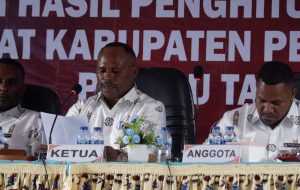 Ketua KPU Pegunungan Bintang Yulius Uopdana ( Tengah) Didampingi Anggota Komisioner saat memimpin Rapat Pleno Rekapitulasi Perolehan Suara Distrik Se-Pegunungan,…