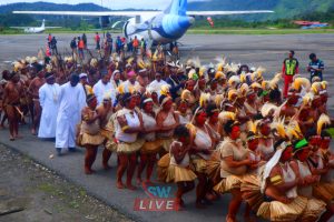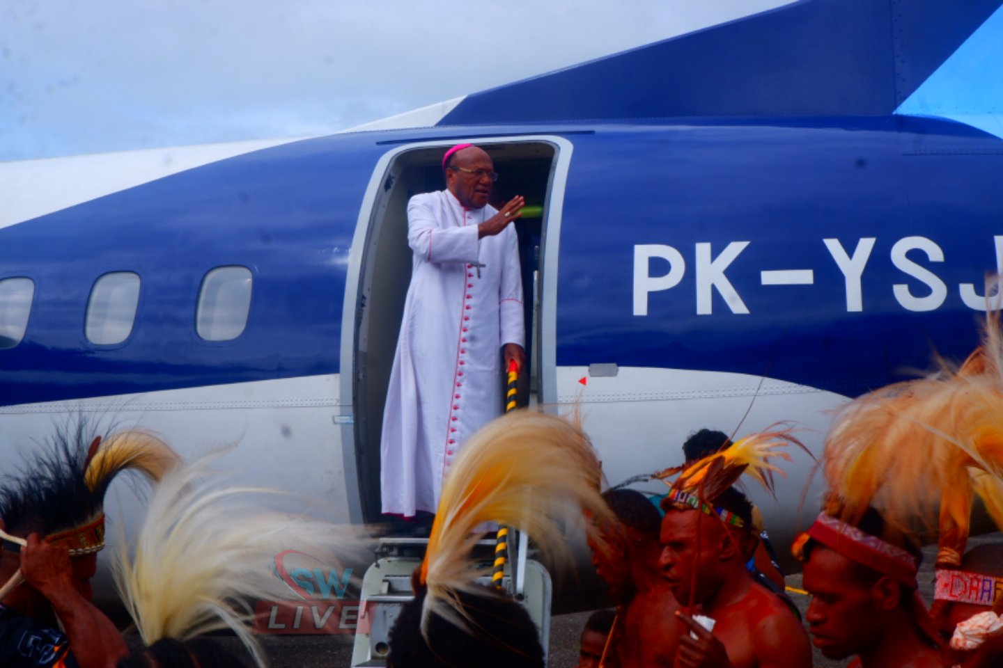 Rombongan Uskup tiba di Oksibil pusat dekenat Pegunungan Bintang, mengunakan Pesawat Udara Trigana Air Service dan disambut dengan tarian adat, lagu -lagu, serta tabuhan tifa sebagai simbol penghormatan.