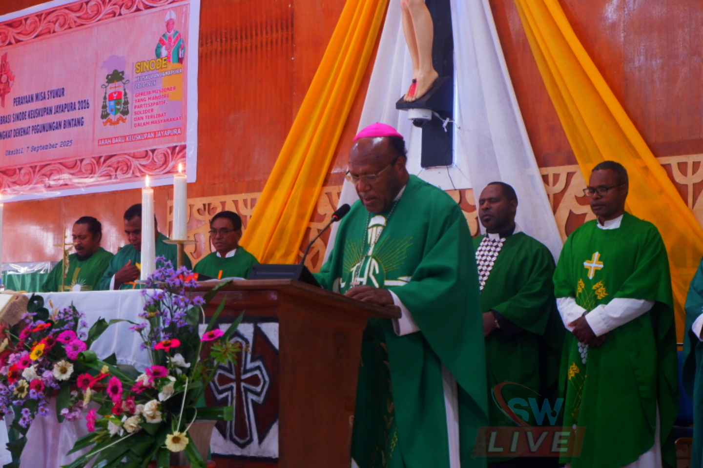 PEGUBIN (SWpapua.com) – Uskup Keuskupan Jayapura, Mgr. Yanuarius Matopai You, Pr, kembali menegaskan pesan iman dan tanggung jawab umat Katolik di wilayah Pegunungan Bintang. Dalam perayaan Misa Kudus bersama ribuan umat di Paroki Roh Kudus, Pusat dekenat Pegunungan Bintang, Uskup Matopai menyampaikan pesan mendalam: “Orang Pegunungan Bintang harus menjadi bintang, bukan hanya bagi Gereja tetapi juga bagi sesama dan masyarakat.”